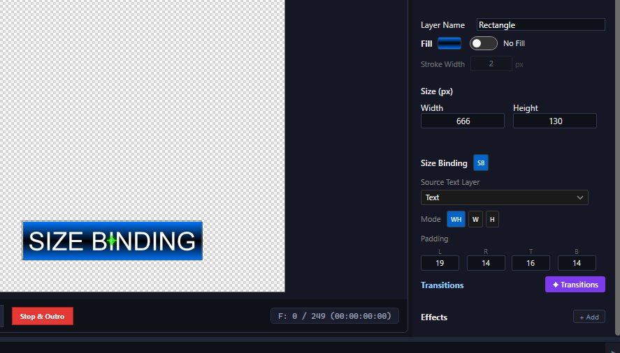 Text layers with full styling (fonts, colors, outlines, shadows, gradients, letter spacing, background), including Fit Width — automatically scales long text to fit a defined area, perfect for dynamic name supers